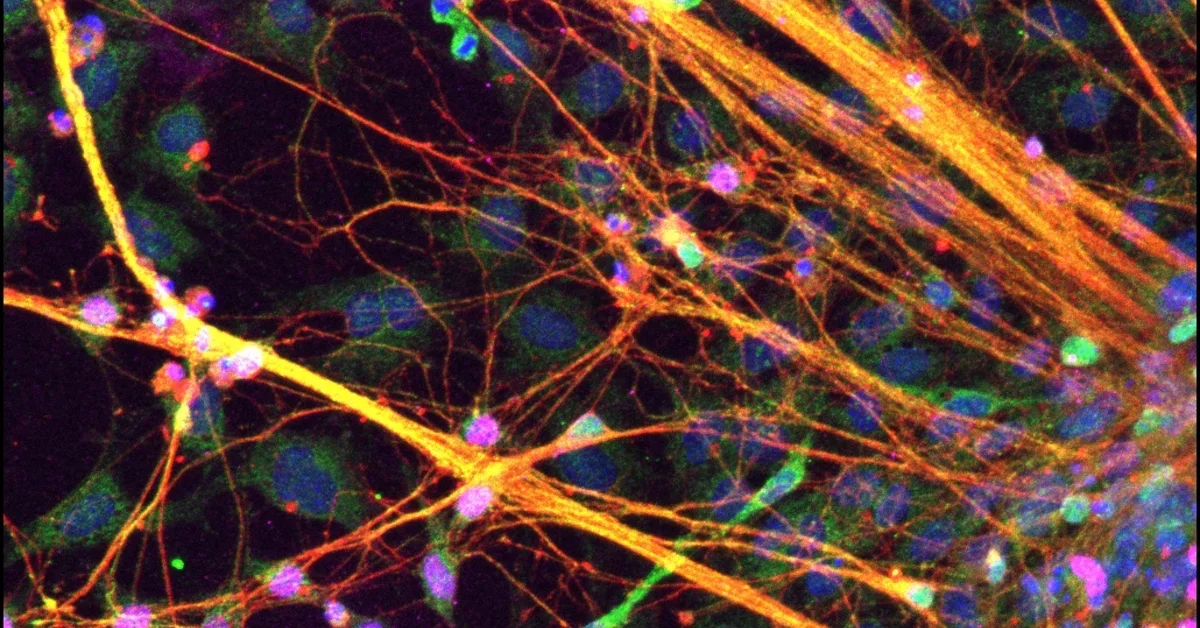 Congratulations Salena! Her image shows a culture of stem-cell derived neural progenitors (red) and differentiated neurons (red) which are extending axons (yellow). Nuclei are stained in blue